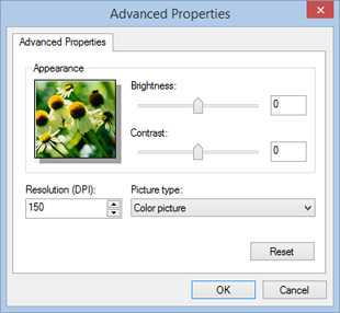 Color picture, Grayscale picture, Black & white picture or text, and Custon Settings which are selected when you click the link to "Adjust the quality of the scanned picture." Choose Custom Settings then click the link to Adjust the quality of the scanned picture. for the Advanced Properties dialog. - Advanced Properties: