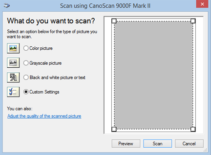 Be sure the text box for picture type is set correctly. Typical black & white pictures are actually gray scale. A Black and white picture is literally that. Black and white with no grays in between. - Choose your settings from the options above, then on future scans you will be able to choose Custom Settings to reuse them.